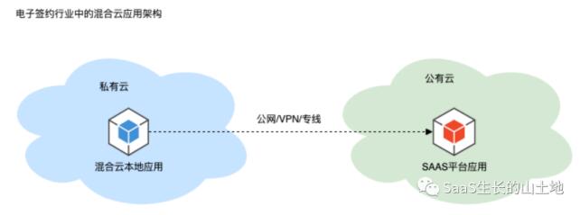 与软件行业通用的混合云不同,在电子签约行业,考虑到合同文件等信息作为企业的机密数据,一般部署在企业内部的应用只能单向请求部署在公有云的服务,所形成的混合云是一种单向请求的“软件应用架构”。这与软件行业一般理解的公有云和私有云之间网络互通的混合云并不相同。