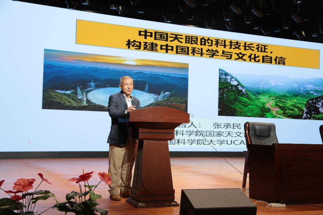 讲座从播放南仁东专题视频资料开始,就牢牢吸引了同学们的眼光,中国科学院国家天文台研究员张承民向在场听众讲述了人民科学家南仁东的科学事迹,以及中国天眼的建设选址、科学原理、天眼的意义与使命等等,南仁东报效国家,忘我工作,追赶世界科技前沿,直到生命最后一刻始终心系祖国科技事业。中国天眼的成功,彰显了中国的道路自信、理论自信、制度自信与文化自信。纵观FAST的艰难历程, 审视其初心与使命,从百年梦想到百年变局,昭示了中国新时代的科技长征。宣讲活动现场同学们如追星般追要张承民教授签名。纷纷和与会专家合影、签名、握手,点燃追“科学家之星”热潮。