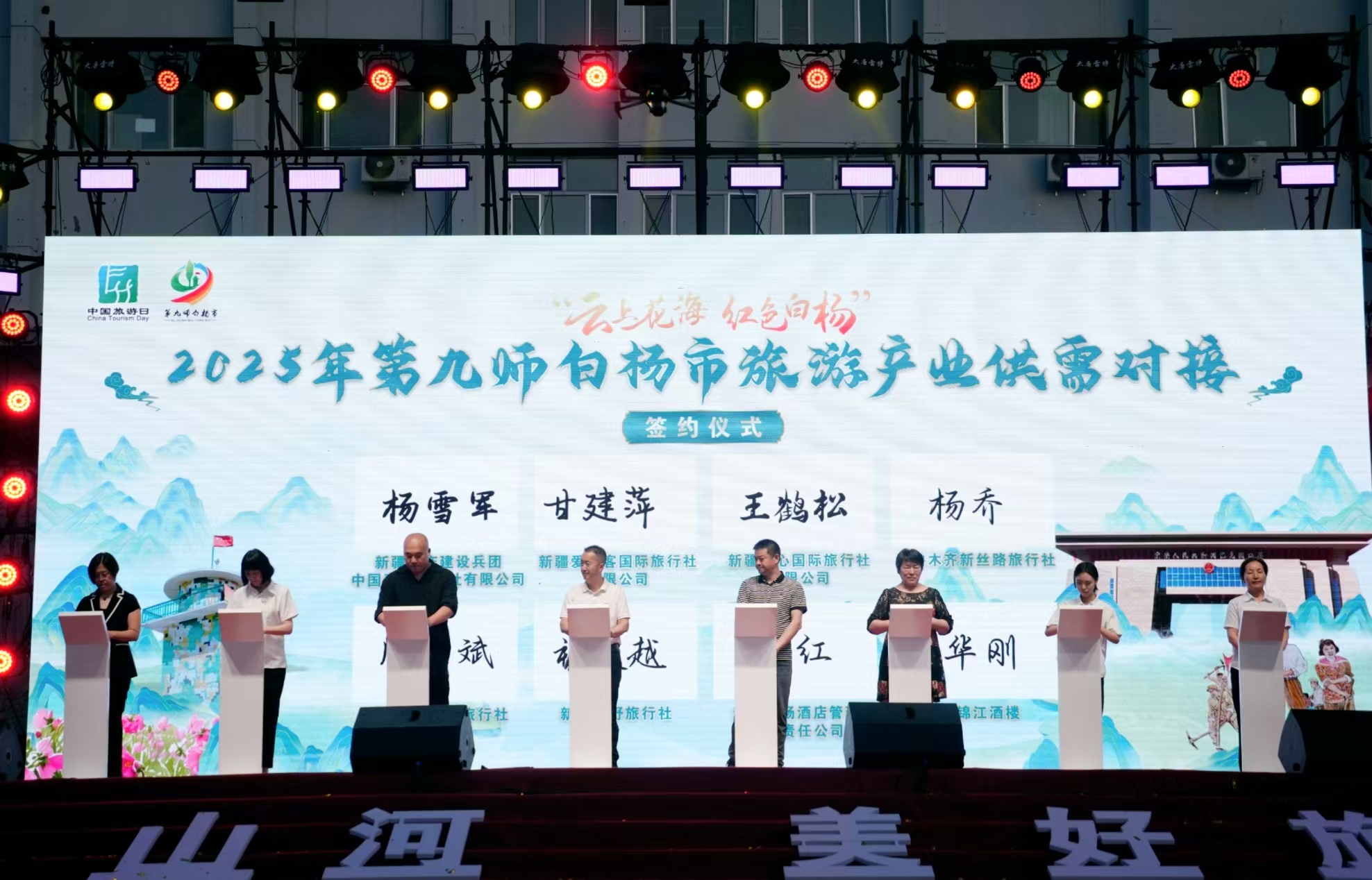 活动中,九师白杨市文化体育广电和旅游局为6名“文旅推荐官”颁发了聘书,激励他们化身文化使者,推介景区景点、人文历史、美食体验等文旅资源,讲好“白杨故事”。文旅推荐官代表在现场向疆内外文旅相关企业代表、游客推介了九师白杨市旅游业优势资源和品牌建设情况,吸引了疆内外文旅相关企业的广泛关注。