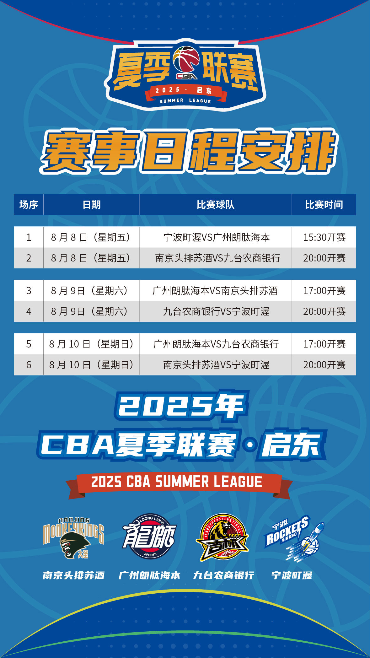 2025年CBA夏季联赛·启东站即将激情开战!8月8日至10日,南京头排苏酒、九台农商银行、广州朗肽海本、宁波町渥四支CBA现役球队将齐聚启东,在江苏省启东中学为全国球迷带来一场热血沸腾的篮球盛宴。