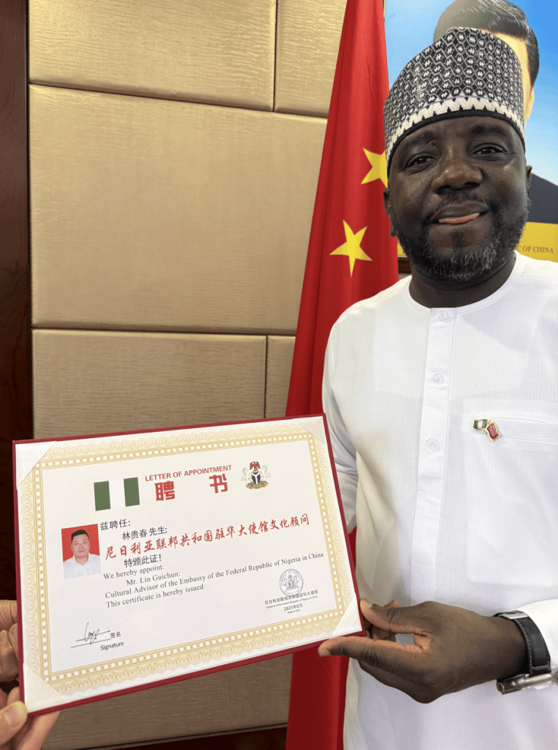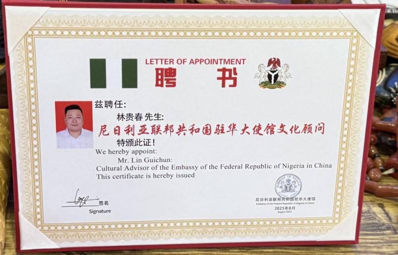 聘书内容显示,林贵春被正式任命为“尼日利亚联邦共和国驻华大使馆文化顾问”(Cultural Advisor of the Embassy of the Federal Republic of Nigeria in China)。该聘书设计庄重,附有尼日利亚国徽、国旗,中英双语正文及大使馆签章,签发时间为2025年8月。