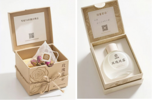 针对包装简陋、同质化问题,学院党总支副书记徐菁晶牵头组建优化小组,师生联合企业资源从“情感+环保”破题:玫瑰花茶用可降解竹纤维外盒(压印立体玫瑰纹)、透明玉米纤维内袋(直观呈现花瓣),盒盖内侧设“晨间情话” 区且扫码可录语音;玫瑰纯露瓶改为弧形磨砂玻璃,配“闺蜜密语”手写区,让产品变身“心意载体”。同时设计“爱情定情礼盒”“孝亲养生套装”,赋予产品场景意义,完成产品模式升级。