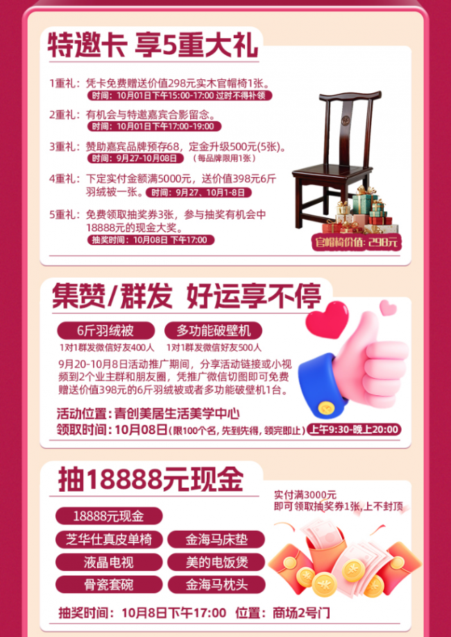 尊享特权,开业礼遇:针对10月1日开业当日到场的顾客,青创美居特别推出“明星特邀卡”,尊享包括实木官帽椅、明星合影、定金升级、下单礼、专属抽奖在内的五重开业礼遇,价值非凡。