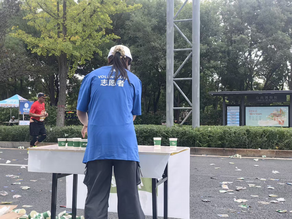 7时30分,发令枪响,选手分四枪依次出发。约五十分钟后,第一拨跑者抵达15公里补给站。陈欣怡与尹睿昇立刻递出水杯,"加油!坚持住!"的呐喊声在汾河畔响起。随后,跑者大部队如潮水般涌来,两人分工协作,指尖泛白仍不停倾倒饮料,膝盖撞桌也顾不上揉,用忙碌身影筑起"能量补给站"。