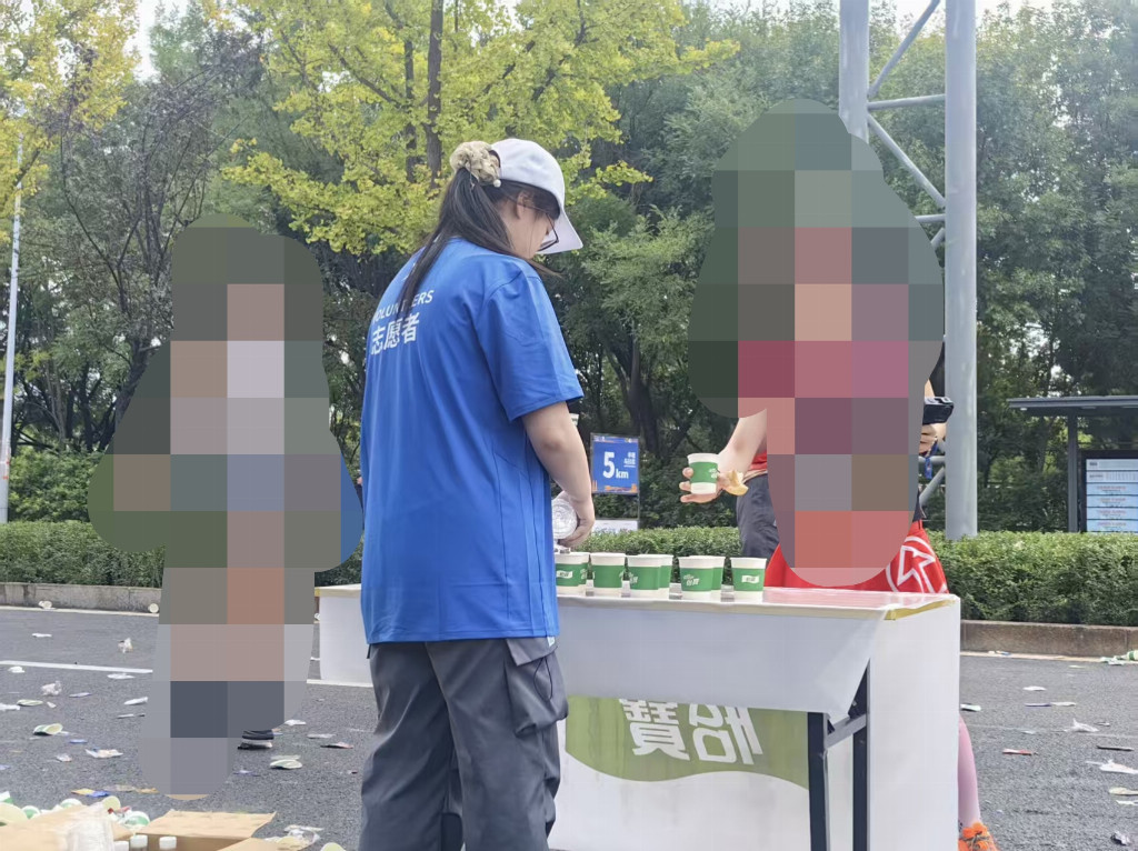当最后一名跑者远去,两人即刻转入收尾工作:捡拾分类垃圾、擦拭桌椅、清点物资、检查急救箱,还与其他志愿者合力拆卸棚架、搬运物资箱。尽管汗水浸透衣衫,每个人脸上都带着满足笑容。直至地面恢复整洁,物资全部清运,他们才踏上归途。