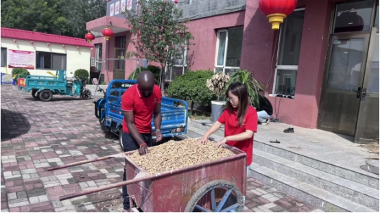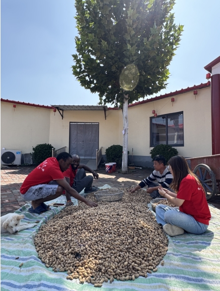图中左一为中国农业大学中非科技小院肯尼亚籍留学生Wilfred Mugwe Mugacha,左二为中国农业大学中非科技小院肯尼亚籍留学生David Karue Mwangi,右二为苏小营村支书关社堂,右一为中国农业大学科技小院研究生张潆心。(晾晒挑拣花生场景)