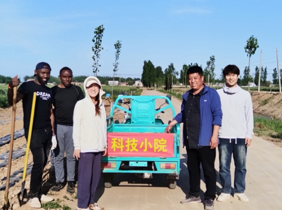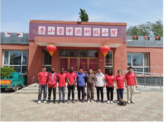 图中左一为中国农业大学科技小院研究生张浩,左二为中国农业大学中非科技小院马拉维籍留学生Yusuf Willard,左三为中国农业大学中非科技小院肯尼亚籍留学生Wilfred Mugwe Mugacha,左四为中国农业大学中非科技小院肯尼亚籍留学生David Karue Mwangi, 左五为苏小营村支书关社堂,左六为青年编剧崔书源,左七为中国农业大学焦小强副教授,右三为中国农业大学中非科技小院马拉维籍留学生Brenda Viyuyi,右四为中国农业大学科技小院研究生张潆心,右一为中国农业大学科技小院研究生佘宗港。