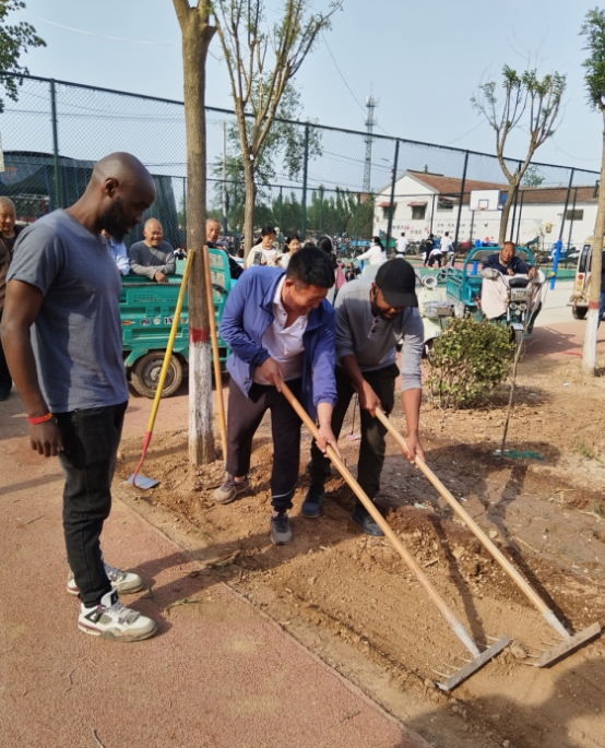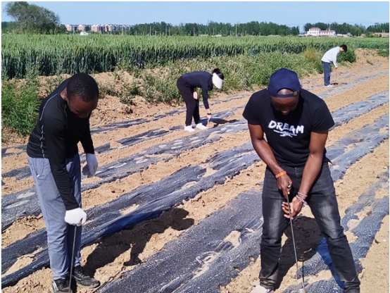 图中主要人物左一为中国农业大学中非科技小院肯尼亚籍留学生David Karue Mwangi,左二为苏小营村支书关社堂,左三为中国农业大学中非科技小院马拉维籍留学生Yusuf Willard。(村支书在教非洲留学生平整土地的技巧)