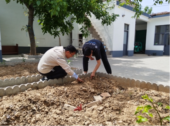 图中左一为中国农业大学焦小强副教授,右一为中国农业大学研究生徐凯。(焦小强副教授在向学生传授种植技巧)