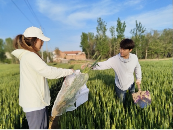 图中左一为中国农业大学科技小院研究生张潆心,右一为中国农业大学科技小院研究生张浩。(小麦采样场景)