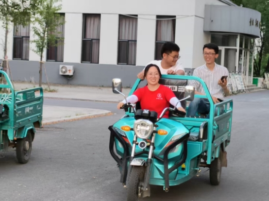 图中驾驶员为中国农业大学科技小院研究生高馨月,后排左一为中国农业大学科技小院研究生龙泉,后排右一为联合国粮农组织干事助理欧亚鹏博士。(驾着科技小三轮下地时的场景)