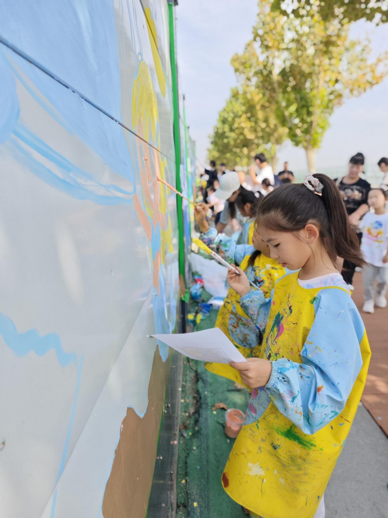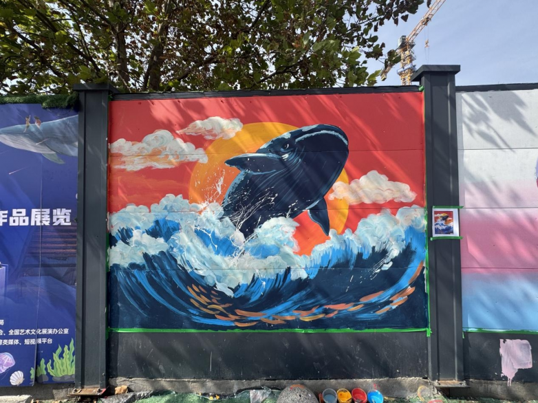活动分为“理论讲解”与“户外实践”两大环节。讲座环节,专业美术老师围绕涂鸦彩绘艺术的起源、表现形式、色彩搭配技巧及创作逻辑展开细致讲解,结合海洋主题案例演示拆解创作难点,帮助参与者快速理解艺术创作思路;实践环节,老师带领孩子们前往中新海博酒店建筑围挡,并在上面开展绘画创作。孩子们在老师的指导下,孩子们亲身体验涂鸦彩绘这种“艺术走进公共空间”的独特乐趣,而原本单调的建筑围挡,也经由创意改造变身充满童趣与活力的“户外艺术画布”,不仅美化了周边城市环境,更成为国庆期间区域内一道别具特色的文化风景。