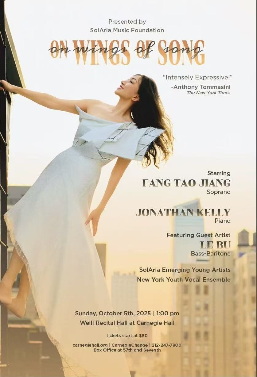 著名女高音歌唱家姜芳涛于10月5日下午1点 登上纽约卡内基音乐厅·威尔音乐厅,隆重呈现独唱音乐会 《乘着歌声的翅膀——从过去到未来》。