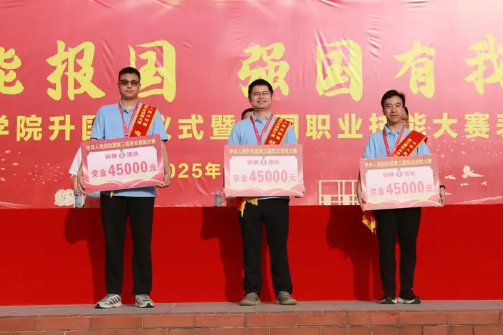 在刚刚落幕的第三届全国技能大赛上,湖南航空技师学院选手奋勇拼搏,斩获3枚铜牌和8个优胜奖,5名选手成功入选第48届世界技能大赛集训队,奖牌总数与国家集训队入选人数均位居全省职业院校榜首,取得了历史性突破。湖南航空技师学院党委委员、副院长王斌宣读表彰通报,学院给予三个铜牌团队各奖励45000元,增材制造团队奖励22500元,其他优胜奖团队各奖励12000元。湖南航空技师学院党委书记张格林及全体党委班子成员为获奖师生颁奖。
