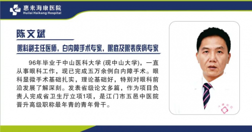 陈文斌主任,毕业于中山医科大学,长期专注于白内障诊疗,是国内少数白内障手术量超过5万例的专家之一。陈主任在海康医院执“刀”近五年,已经成为海康眼科的“金字招牌”。