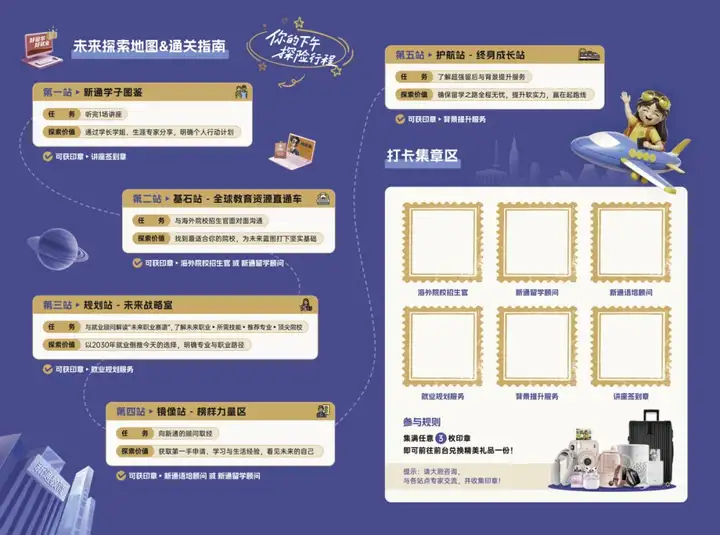 一张地图,全链打通!活动当天,亲临新通现场,打卡「未来探索地图」五大核心站点,亲身体验从留学到就业的完整规划路径。现场集满3枚印章,即可解锁专属精美礼品,为你的未来探索之旅加冕。