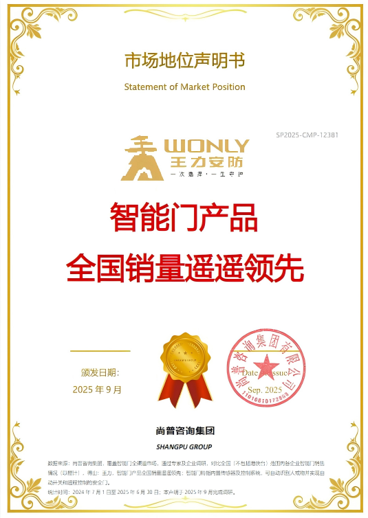 9 月 9 日,在王力 2025 旗舰新品全球发布会上,尚普咨询集团权威认证王力智能门产品 “全国销量遥遥领先”,使其成为继安全门、智能锁后又一拿下该荣誉的核心品类。