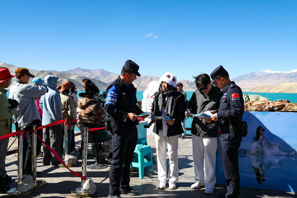 10月14日,新疆出入境边防检查总站克州边境管理支队加克拉克边境派出所创新宣传方式,组织民警深入景区开展流动反诈宣传在游客密集区域,民警开设“微课堂...