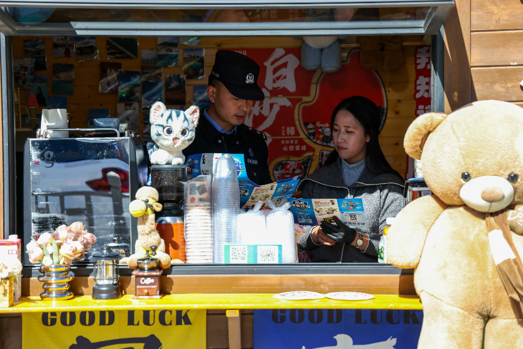 10月14日,新疆出入境边防检查总站克州边境管理支队加克拉克边境派出所创新宣传方式,组织民警深入景区开展流动反诈宣传。民警走进商铺,结合真实案例讲解货款诈骗、二维码调包等常见手法,帮助商户守好“钱袋子”。
