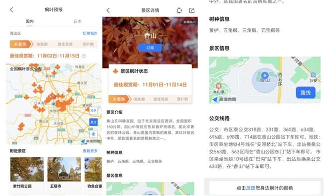 作为连接用户与秋日美景的“桥梁”,墨迹天气“枫叶预报”功能首先聚焦本地化需求,通过聚合全国知名赏枫景点信息,结合用户实时定位,智能推荐周边观赏胜地,真正实现“家门口寻秋色”。系统会基于用户地理位置筛选出距离最近、当前观赏度较高的景区,用户点击具体景区名称,即可查看完整的“赏枫指南”,不仅包含红叶最佳观赏期、景区特色亮点等核心信息,还详细标注了公交路线、自驾路线等实用出行提示。点击景区地图的“路线”,还可选择跳转到地图app或打车app,操作便捷高效。例如,居住在北京市海淀区的用户定位后,系统会优先推荐香山公园,并提示其红叶观赏关键信息,帮助用户省去信息搜集时间,快速规划赏枫行程。
