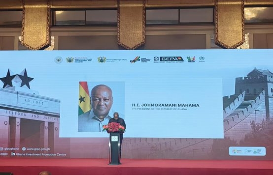 图:加纳共和国总统约翰·德拉马尼·马哈马(John Dramani Mahama)发表演讲,强调非洲在激发人类潜力与推动发展方面的重要作用,并对中加合作前景表达乐观态度