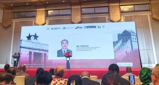 图:国家商务部西亚非洲司二级巡视员袁林则在致辞中指明了制度性合作的清晰路径。他强调,中方将以中非合作论坛为契机,与加方加快商签经济伙伴关系协定,并推动对非“零关税”举措切实落地,从政策层面为企业开拓更广阔的贸易投资空间
