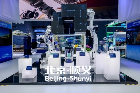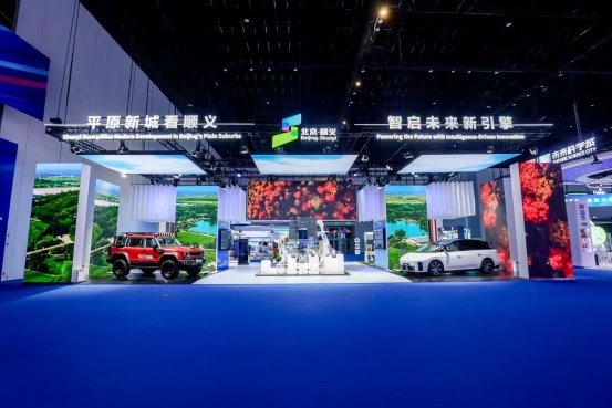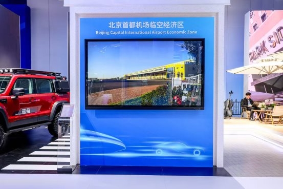 展区中部的功能区展示区设置了4块 98英寸触摸屏,通过视频、图文等多种形式,集中展示了首都机场临空经济区、中关村顺义园、中德产业园、HICOOL产业园以及京津冀汽车生态港顺义园的蓬勃发展态势,充分彰显了顺义产业园区的创新活力与发展潜力。
