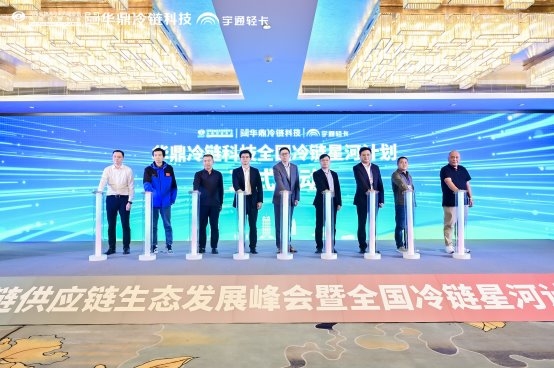 在与会嘉宾的共同见证下,河南省物流与采购联合会冷链行业分会秘书长郭鹏、华鼎冷链科技CEO王君、宇通轻卡总经理彭浩、华鼎冷链科技副总经理洪德智等九位来自协会与企业的代表共同启动了“星河计划”。