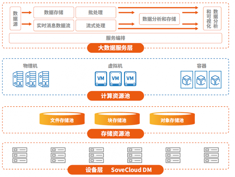 亿万克创新推出新一代蛟云SoveCloud DM分布式存储,基于全对称分布式架构设计,只需部署标准服务器即可将硬盘整合为块/文件/对象三大存储资源池,为大数据平台提供全流程支撑。