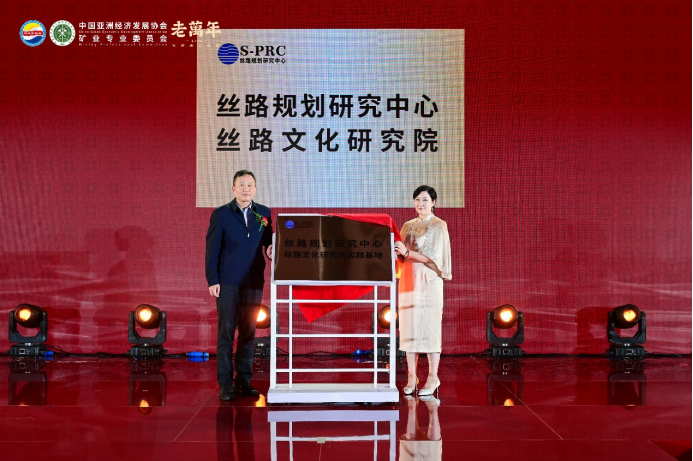 老萬年黄金珠宝有限公司董事长罗丹与丝路规划研究中心总规划师和峰共同为丝路文化研究院揭牌。