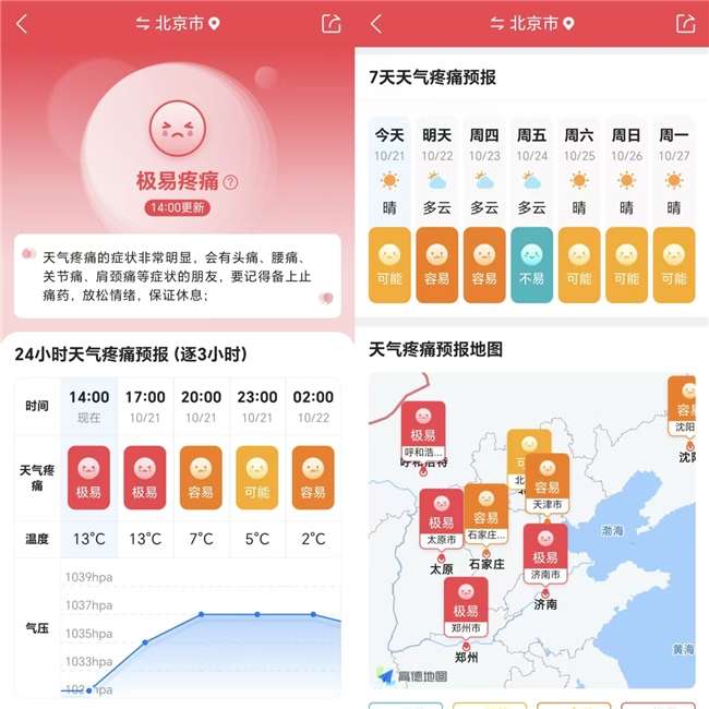 关节疼痛是降温期另一常见健康困扰。气温骤降、气压变化会影响关节周围组织的血液流通与代谢,诱发或加重风湿性关节炎、骨关节炎患者的关节疼痛。墨迹天气的“天气疼痛”功能,通过整合气温、气压、湿度等数据,提前预判关节不适风险,打破“疼痛发作才应对”的被动局面:以“极易”、“容易”、“可能”等分级呈现24小时及7天关节疼痛风险,并给出“备上止痛药”等提示,同时还通过天气疼痛预报地图展现全国不同区域天气疼痛预报情况,为短途或长图出行用户提供参考。