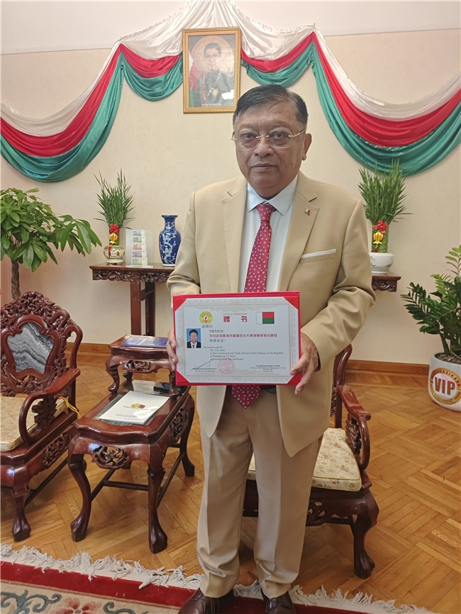 马达加斯加驻华大使馆特邀中外友好文化艺术顾问杨晓琴女士亲授荣誉证书