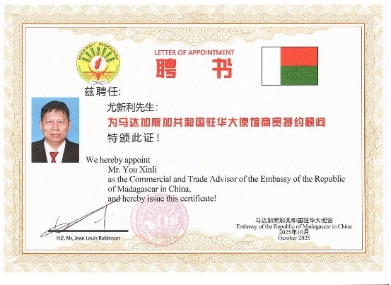 2025年10月19日,深圳在“一带一路”倡议的蓬勃推动下,中国健康产业再传捷报。丝路花语集团董事长杨董携手大时代生物工程(深圳)有限公司总经理尤新利,成功推动旗下“蛹虫草”系列产品被马达加斯加共和国驻华大使馆列为指定用品,并助力尤新利总经理荣获马达加斯加驻华大使馆商贸特约顾问称号。这一里程碑事件标志着中国健康产品正式迈向国际舞台,为全球消费者带来创新养生解决方案。