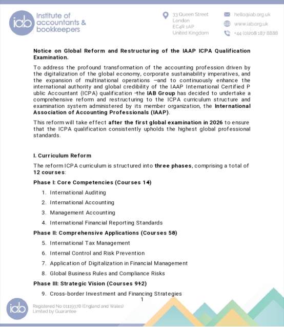 近日,英国国际专业会计师公会(IAAP)官宣,将在全球范围内对国际注册会计师(ICPA)考试体系进行系统性调整。这一决策由IAB GROUP 主导,旨在应对世界经济数字化转型、企业可持续发展及跨国经营带来的财会行业变革,进一步提升 ICPA 认证的国际权威性与全球公信力,确保认证标准始终与全球专业水平同步。调整将于 2026 年度全球第一次考试结束后正式落地,为 ICPA 认证发展划定全新阶段。