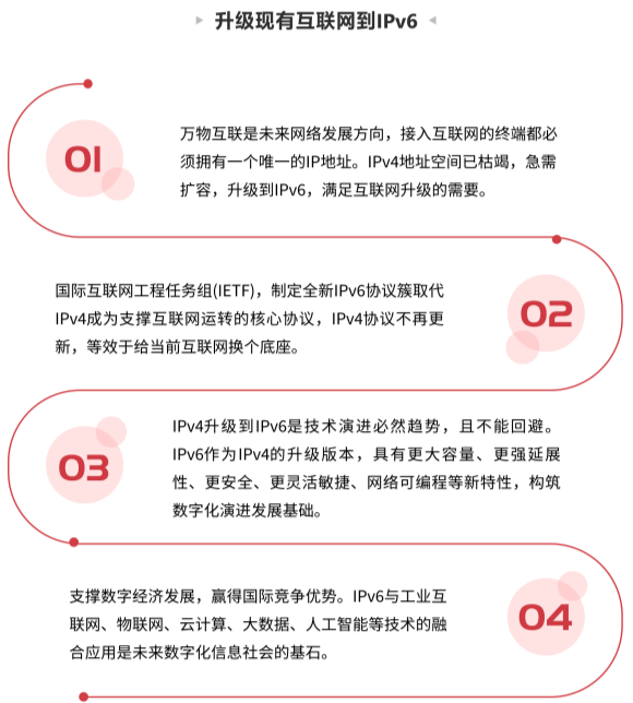 合规只是第一步,IPv6的内在价值在于成为企业数字化转型的战略基石。IPv6所具备的海量地址空间、多维分组能力、开放灵活的架构、极简的组网方式、柔性扩展能力、全域内生安全以及面向大数据与AI的友好性,共同构成下一代互联网的核心竞争力。