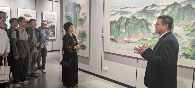 开幕式结束后,新金陵画派传承人万里君与南航艺术学院院长板俊荣联袂为南航艺术学院的学生授课,将当晚的美育课堂直接“搬”到了画展现场。此次课堂并未拘泥于刻板的理论框架,而是聚焦中国画与青绿山水的核心魅力,为学生们带来了一堂别开生面的美育课,极大调动了学生们的参与热情,现场互动踊跃,氛围热烈高涨。