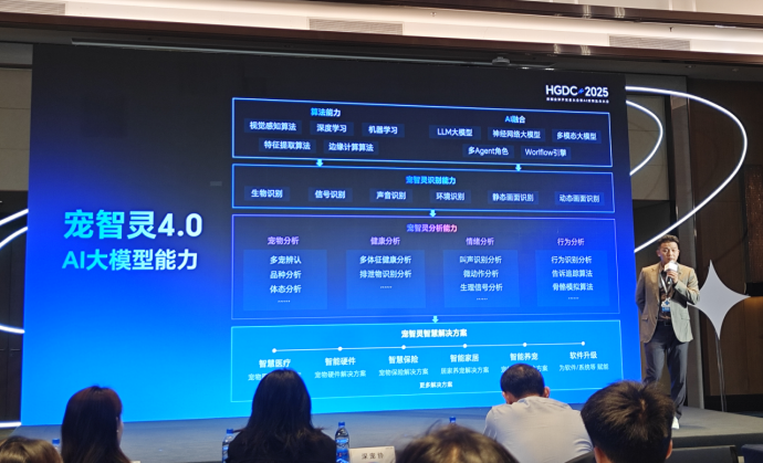 刘聪凯表示,宠物产业正迎来智能化与数据化的深度转型。宠智灵基于自研的宠物AI大模型“宠生万象4.0”,构建了融合图像识别、声音分析与生理信号监测的多模态宠物AI系统,实现对宠物健康、行为与情绪的精准理解。这一体系不仅具备跨物种识别和状态分析能力,更在宠物AI健康管理与宠物医疗大模型方向形成了技术延展,成为宠智灵推动宠物生态智能化升级的核心基础。