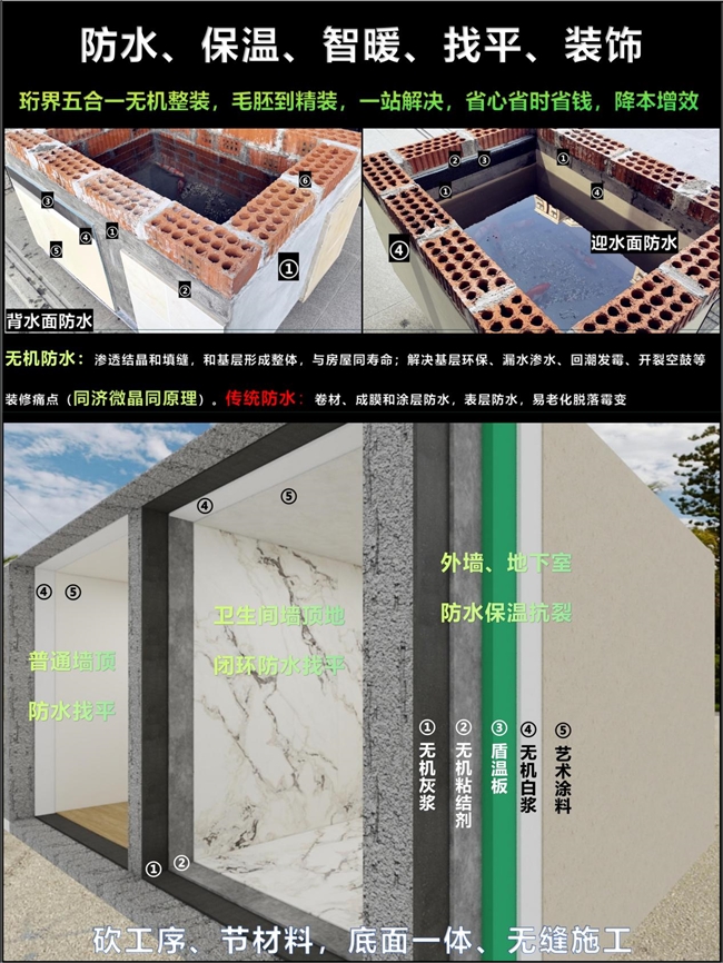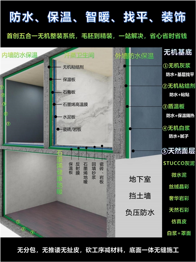 经过多年研发,恒炜自主打造出 “珩界五合一无机整装系统”,实现了从基础材料到施工工艺的全面突破 —— 以无机灰浆、盾温板、无机白浆为基础层,石墨烯智暖系统为功能层,STUCCO 灰泥、微水泥、阿尔卑斯山石灰石为饰面层,形成 “防水 + 保温 + 找平 + 智暖 + 装饰” 的一体化解决方案。同时,恒炜联合桦德时代 145# 无机系列产品(获绿建三星、SGS 认证),从基层到饰面实现 “无醛无 VOC”,从源头解决传统装修的污染、渗漏、发霉等痛点,彰显出技术驱动型品牌的硬实力。