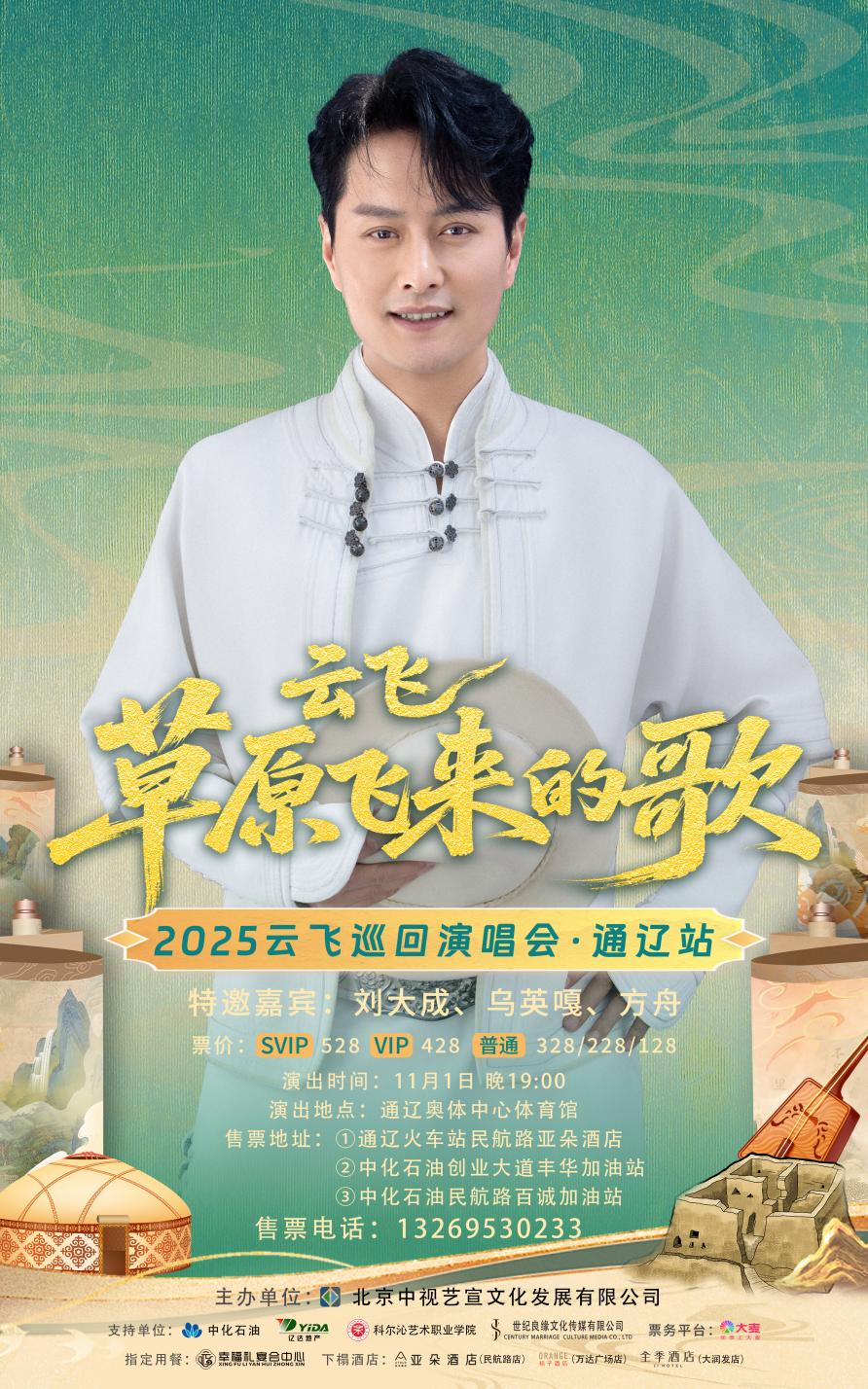 草原的风已吹响邀约的号角,悠扬的歌声即将在通辽回荡。11 月 1 日19:00,让我们相聚通辽奥体中心体育馆,在云飞的歌声中感受草原的赤诚与温暖,共度一场难忘的草原音乐时光!继通辽站之后,11 月 15 日,“草原飞来的歌” 巡回演唱会也将登陆包头奥体中心体育馆,草原之约未完待续,敬请期待云飞为 “鹿城” 歌迷带来专属的草原音乐盛宴。