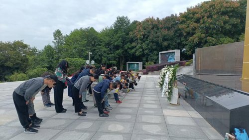 默哀毕,孩子们在家长的陪伴下,手捧象征敬意与怀念的鲜花,缓步前行,将鲜花郑重地敬献于碑前。这一躬一献,不仅是对先烈的缅怀,更是一次生动的传承,让红色的种子在幼小的心灵中生根发芽。