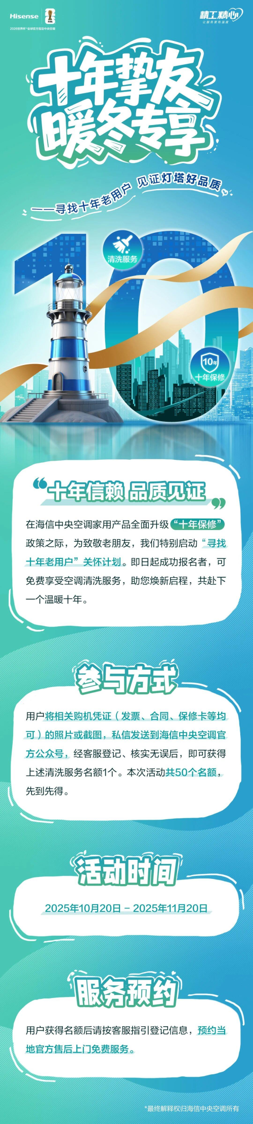 在海信中央空调家用产品全面升级“十年保修政策之际,为致敬老朋友,我们特别启动“寻找十年老用户”关怀计划。即日起成功报名者,可免费享受空调清洗服务,助您焕新启程,共赴下一个温暖十年。