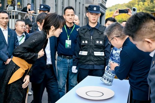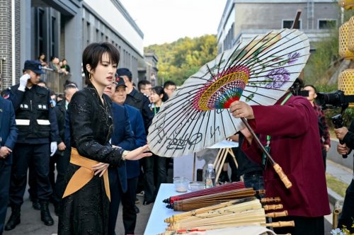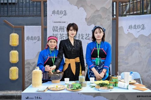 姚安娜穿行于各展位之间,兴致盎然地与各位非遗传承人亲切互动。在景德镇制瓷技艺展位,她与非遗传承人孙立新共绘青花瓷盘,感受泥火幻化的艺术;她称赞上饶甲路纸伞“非常精美”,并在客家擂茶展台亲手体验制作,品味其独特的民族风味,从中感悟非遗成功申遗的经验。