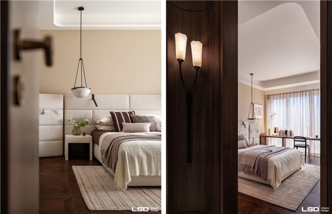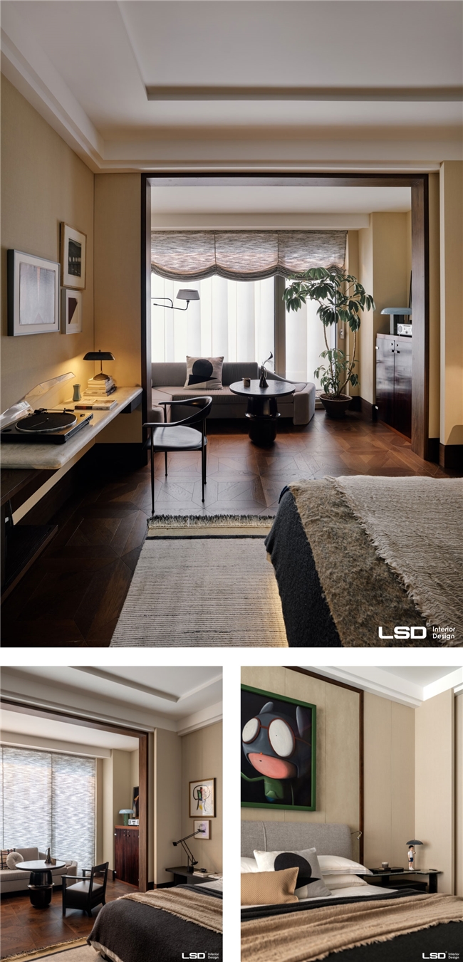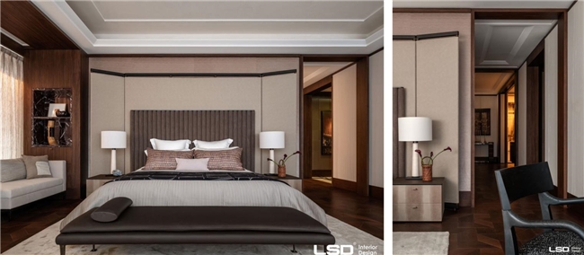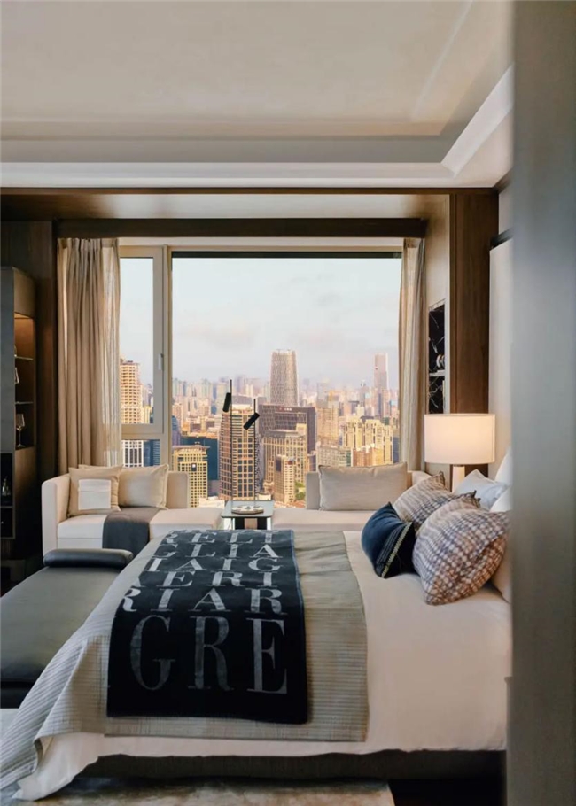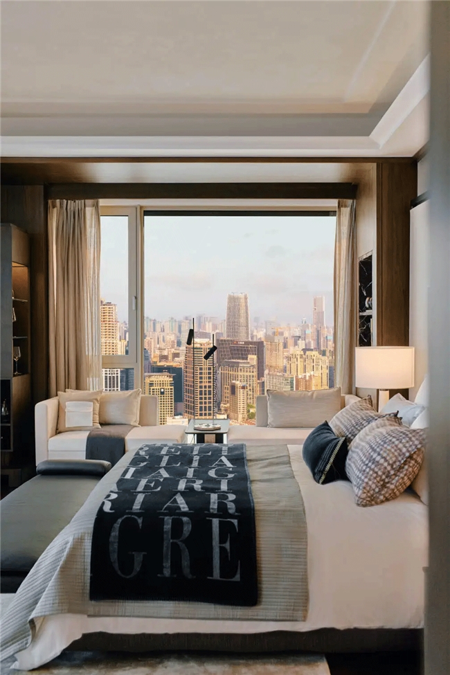 主卧在功能构成上十分丰富,270度转角窗让光成为空间的度量,也让外部景观成为构成主卧的一部分。临窗的部分软装分别设置了沙发休闲区和minibar休闲区,自然而然的把人的行为跟景观相关联。