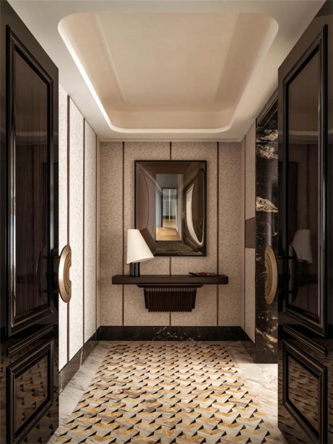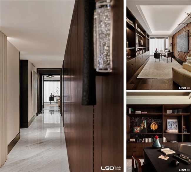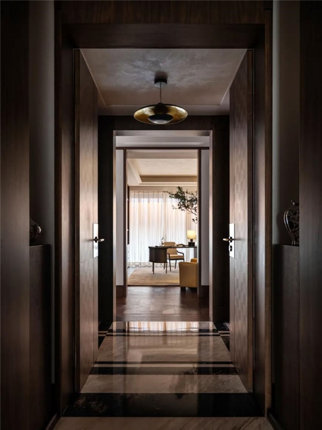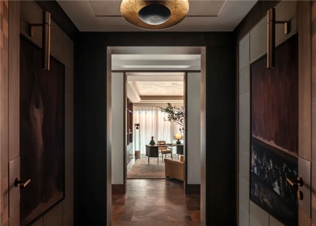 因此,我们希望在“静区”(也就是卧室的部分),基于秩序创造精神和现实的自由。具体落位手法其一是“灰空间”的打造——即客厅通往主卧的内玄关以及内玄关通往次卧的艺术走廊,这两部分空间设计团队不去定义它究竟在功能上如何归属,而是希望它具有“介质”的属性,能够帮助居住者得到空间变化在身体上的直接感受,从而引发情绪的转换,同时也能提供空间的延伸感。