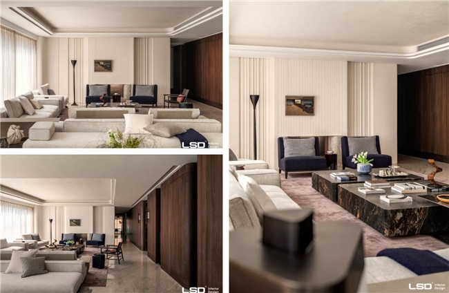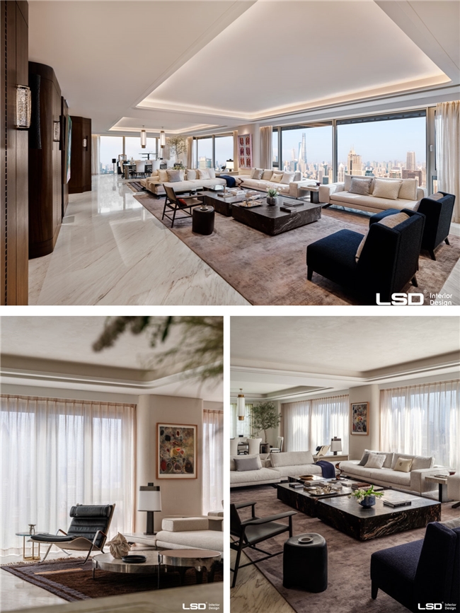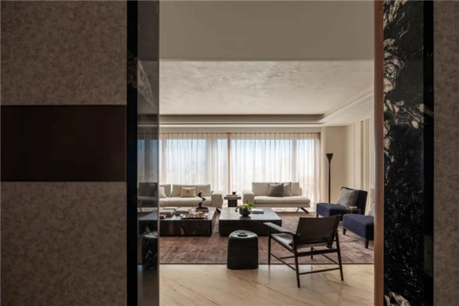 客厅的尺度非常宏大,几乎是其他相似产品的1.5倍,面对空间设计如何展开的问题,设计团队首先要做的就是对于空间资源的分配与空间层级的逻辑归纳。