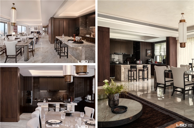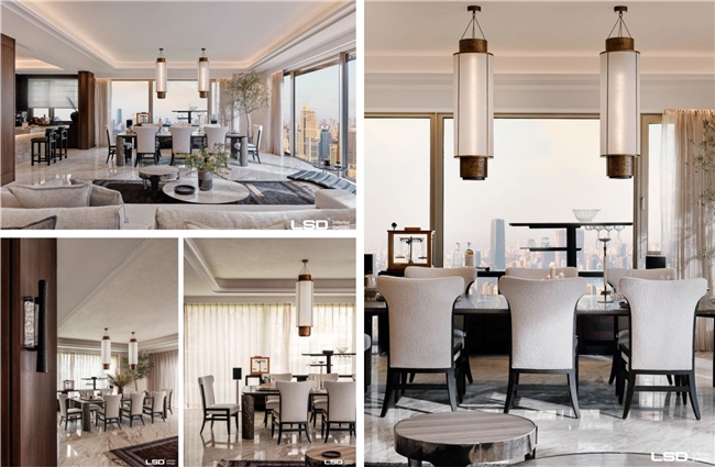 宴会厅有180度的环绕式窗景,设计团队希望能让外部环境自然的融入室内。因此,设计上最重要的因素之一,就是用餐环境与窗外景观的互动关系。软装在临窗的位置上加设雕塑性功能餐边柜,同时在餐边柜两侧放置GOLDMUND音响。家庭成员在使用的过程中,就会自然的与室内、与景观产生了交互。