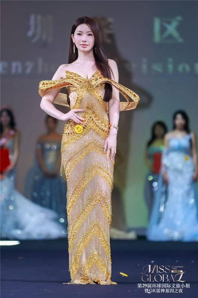 黄玉萍身着一袭金色亮片礼服惊艳亮相,其专业的台步与镜头感令人印象深刻。作为资深模特,她曾合作路易威登、香奈儿、爱马仕等顶级时尚品牌,并参与路虎、保时捷、奔驰等知名车展活动,在YSL、迪奥等美妆领域也拥有丰富经验。2025年,她先后获得"全球中华小姐总决赛南京冠军"及本次赛事季军,展现出从商业模特向文旅使者成功转型的实力。