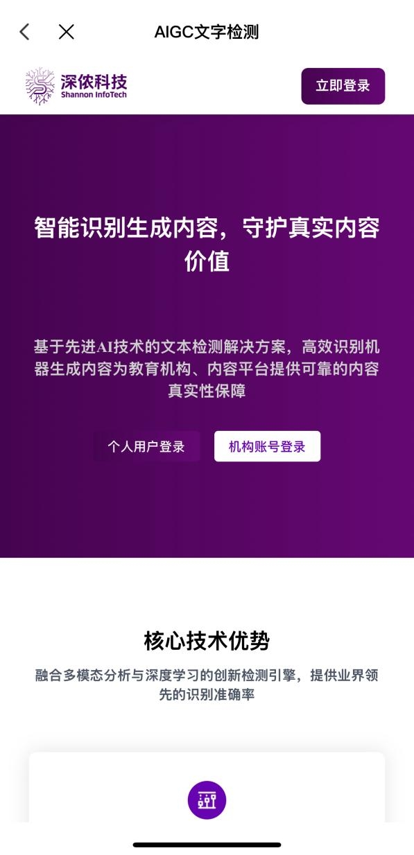 在此合作背景下,近日,湖南省统一超级服务端“湘易办”APP完成重要功能升级,深侬科技AIGC文字内容检测产品正式上线运行。该产品凭借前沿人工智能技术,在教育领域构建内容真实性防护网,同时为政府项目申报场景筑牢内容可信防线,不仅为“湘易办”3500万用户提供保障,更标志着AI检测技术在跨领域应用中迈出关键一步。