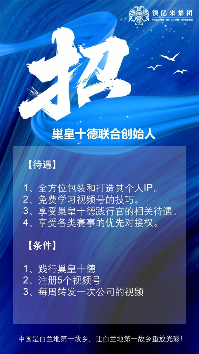 领亿来集团计划在全国2000个区县,招募2000位巢皇十德联合创始人。每位联合创始人将成为所在区域的文化传播与市场拓展的核心力量,共同推动巢皇十德文化的践行。此规划旨在汇聚一批认同传统文化价值、富有开拓精神的同行者,厚德载物,日行十德,不断积徳修德补德,帮助大家进一步父慈子孝、夫妻恩爱、家庭幸福、身体健康,共创美好未来。