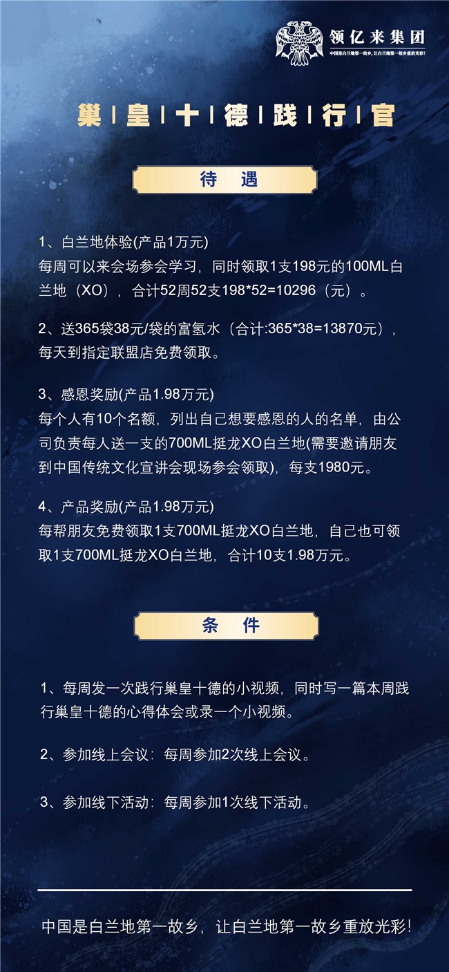 优质产品体验权: 可体验公司提供的多种优质产品,深入感受中国白兰地的魅力与文化内涵。巢皇十德联合创始人直接享受巢皇十德践行官的四大福利待遇:1、白兰地体验(产品1万元):每周可以来会场参会学习,同时领取1支198元的100ML白兰地(XO),合计52周52支,共198*52=10296元);2、送365袋38元/袋的富氢水(合计:365*38=13870元),每天到指定联盟店免费领取;3、感恩奖励(产品1.98万元):每名践行官有10个名额,列出自己想要感恩的人的名单,由公司负责每人送一支的700ML挺龙XO白兰地(需要邀请朋友到中国传统文化宣讲会现场参会领取),每支1980元;4、产品奖励(产品1.98万元):每帮朋友免费领取1支700ML挺龙XO白兰地,自己也可领取1支700ML挺龙XO白兰地,合计10支共1.98万元。